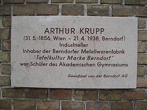 Arthur Krupp war Präsident des Industriellen Clubs, dem Vorläufer der IV. Er war auch maßgeblich daran beteiligt, das Haus der Industrie am Wiener Schwarzenbergplatz 4 zu schaffen. Einer der Säle trägt seinen Namen. Mit Pioniergeist und Elan gelang es ihm, dass die „Berndorfer Metallwaren" weit über die Grenzen der damaligen Monarchie hinaus bekannt wurden und hervorragenden Absatz fanden. Krupp erkannte und nutzte die Bedeutung des Exporthandels - auf sein Betreiben hin wurde beispielsweise der Hafen Triest ausgebaut, um die österreichische Außenwirtschaft zu stärken. Die Herstellung und Montage dieser Gedenktafel wurde von der Berndorf AG finanziert.