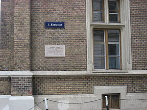 Eine steinerne Gedenktafel für den österreichischen Industriellen Arthur Krupp wurde unweit des Hauses der Industrie angebracht.